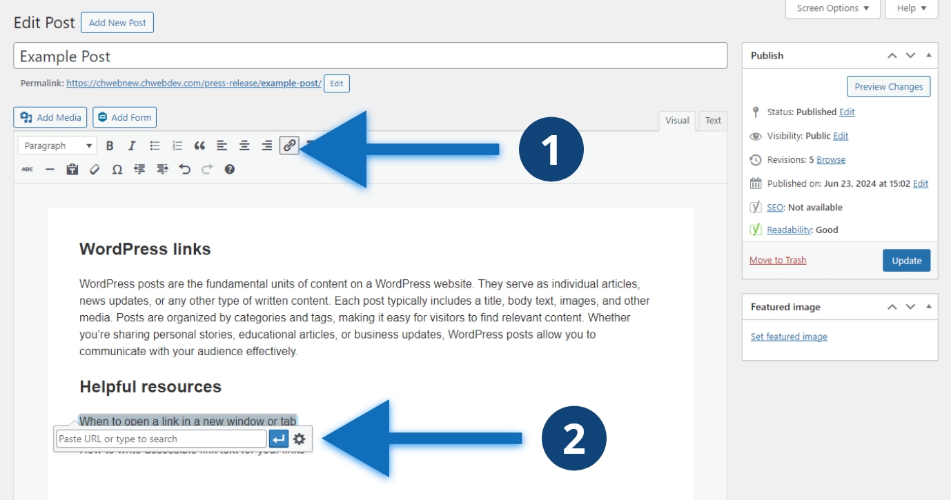 You can also use keyboard shortcuts to insert a link. Use “ctrl + k” on Windows to insert a link on selected text. On Mac you use “command + k.”