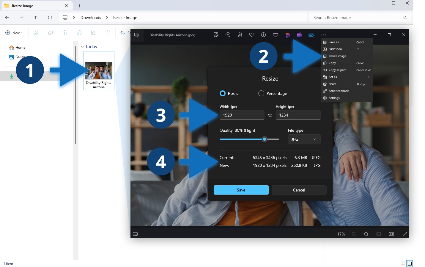 - Adjust the width to 1080px-1920px for the longest edge and the quality to 60% – 80%.